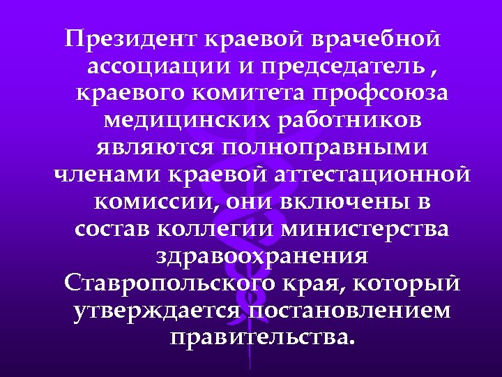 Президент краевой врачебной ассоциации и председатель , краевого комитета профсоюза медицинских работников являются полноправными членами краевой аттестационной комиссии, они включены в состав коллегии министерства здравоохранения Ставропольского края, который утверждается постановлением правительства.