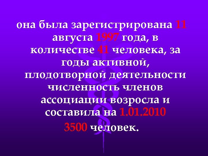 она была зарегистрирована 11 августа 1997 года, в количестве 41 человека, за годы активной, плодотворной деятельности численность членов ассоциации возросла и составила на 1. 01. 2010 3500 человек.