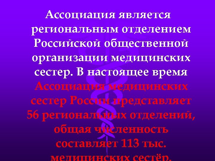 Ассоциация является региональным отделением Российской общественной организации медицинских сестер. В настоящее время Ассоциация медицинских сестер России представляет 56 региональных отделений, общая численность составляет 113 тыс.