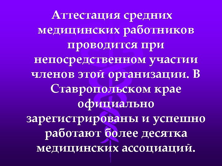Аттестация средних медицинских работников проводится при непосредственном участии членов этой организации. В Ставропольском крае официально зарегистрированы и успешно работают более десятка медицинских ассоциаций.