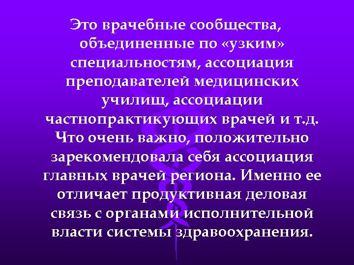 Это врачебные сообщества, объединенные по «узким» специальностям, ассоциация преподавателей медицинских училищ, ассоциации частнопрактикующих врачей и т. д. Что очень важно, положительно зарекомендовала себя ассоциация главных врачей региона. Именно ее отличает продуктивная деловая связь с органами исполнительной власти системы здравоохранения.