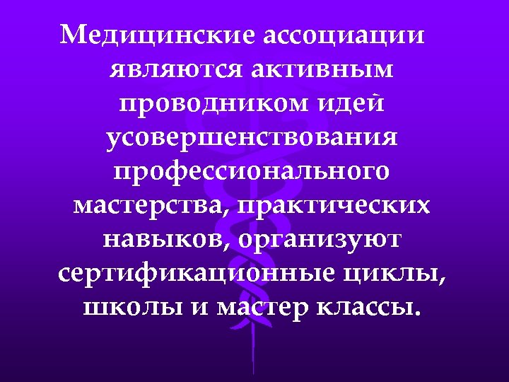 Медицинские ассоциации являются активным проводником идей усовершенствования профессионального мастерства, практических навыков, организуют сертификационные циклы, школы и мастер классы.