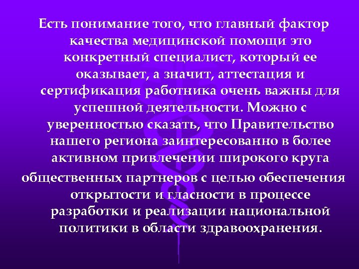 Есть понимание того, что главный фактор качества медицинской помощи это конкретный специалист, который ее оказывает, а значит, аттестация и сертификация работника очень важны для успешной деятельности. Можно с уверенностью сказать, что Правительство нашего региона заинтересованно в более активном привлечении широкого круга общественных партнеров с целью обеспечения открытости и гласности в процессе разработки и реализации национальной политики в области здравоохранения.