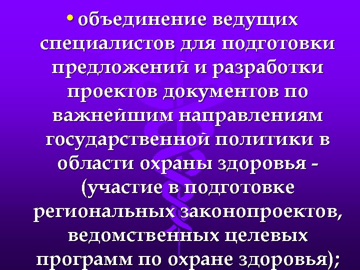 • объединение ведущих специалистов для подготовки предложений и разработки проектов документов по важнейшим направлениям государственной политики в области охраны здоровья (участие в подготовке региональных законопроектов, ведомственных целевых программ по охране здоровья);