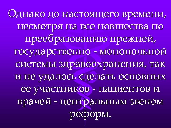 Однако до настоящего времени, несмотря на все новшества по преобразованию прежней, государственно - монопольной системы здравоохранения, так и не удалось сделать основных ее участников - пациентов и врачей - центральным звеном реформ.