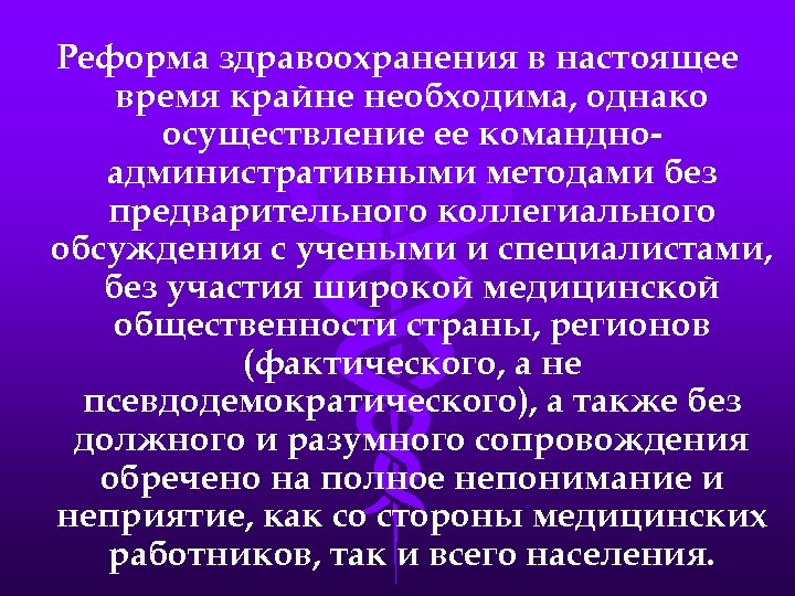 Реформа здравоохранения в настоящее время крайне необходима, однако осуществление ее командноадминистративными методами без предварительного коллегиального обсуждения с учеными и специалистами, без участия широкой медицинской общественности страны, регионов (фактического, а не псевдодемократического), а также без должного и разумного сопровождения обречено на полное непонимание и неприятие, как со стороны медицинских работников, так и всего населения.