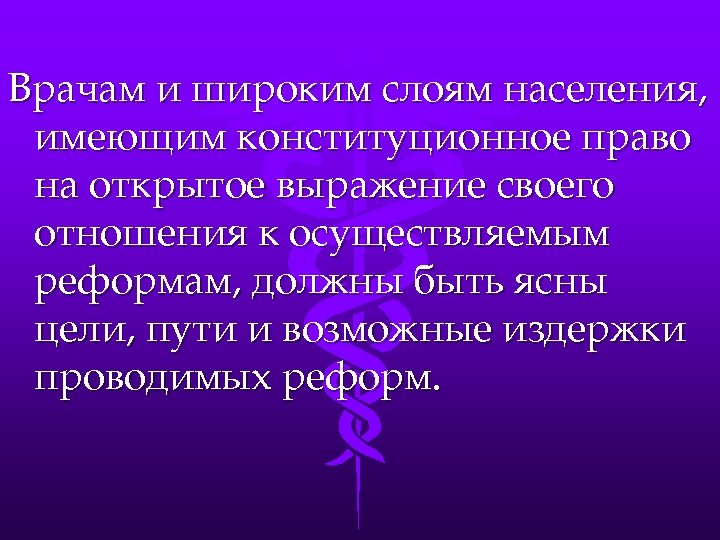 Врачам и широким слоям населения, имеющим конституционное право на открытое выражение своего отношения к осуществляемым реформам, должны быть ясны цели, пути и возможные издержки проводимых реформ.