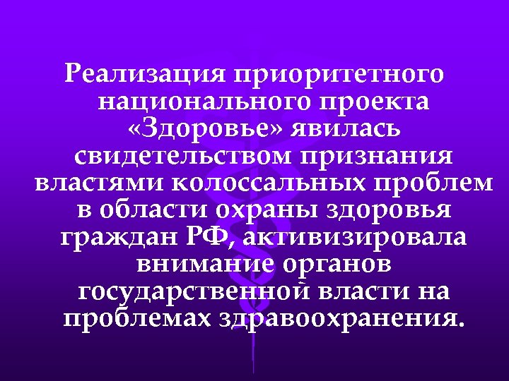 Реализация приоритетного национального проекта «Здоровье» явилась свидетельством признания властями колоссальных проблем в области охраны здоровья граждан РФ, активизировала внимание органов государственной власти на проблемах здравоохранения.