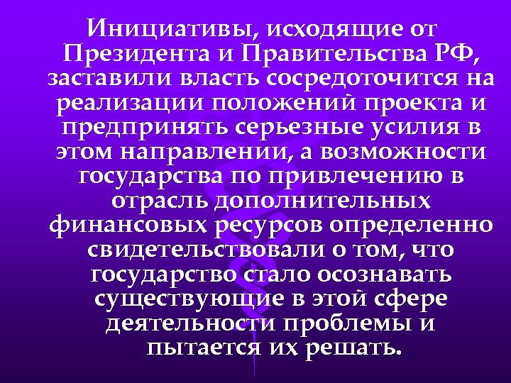 Инициативы, исходящие от Президента и Правительства РФ, заставили власть сосредоточится на реализации положений проекта и предпринять серьезные усилия в этом направлении, а возможности государства по привлечению в отрасль дополнительных финансовых ресурсов определенно свидетельствовали о том, что государство стало осознавать существующие в этой сфере деятельности проблемы и пытается их решать.