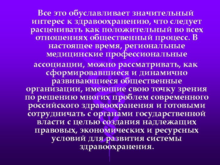 Все это обуславливает значительный интерес к здравоохранению, что следует расценивать как положительный во всех отношениях общественный процесс. В настоящее время, региональные медицинские профессиональные ассоциации, можно рассматривать, как сформировавшиеся и динамично развивающиеся общественные организации, имеющие свою точку зрения по решению многих проблем современного российского здравоохранения и готовыми сотрудничать с органами государственной власти с целью создания надлежащих правовых, экономических и ресурсных условий для развития системы здравоохранения.