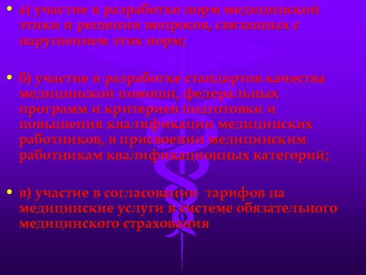 • а) участие в разработке норм медицинской этики и решении вопросов, связанных с нарушением этих норм; • б) участие в разработке стандартов качества медицинской помощи, федеральных программ и критериев подготовки и повышения квалификации медицинских работников, в присвоении медицинским работникам квалификационных категорий; • в) участие в согласовании тарифов на медицинские услуги в системе обязательного медицинского страхования