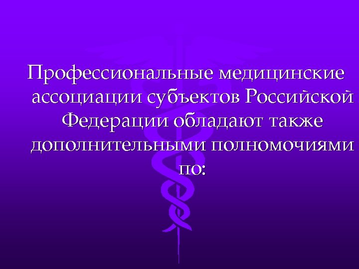 Профессиональные медицинские ассоциации субъектов Российской Федерации обладают также дополнительными полномочиями по: