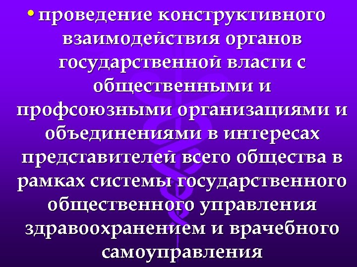 • проведение конструктивного взаимодействия органов государственной власти с общественными и профсоюзными организациями и объединениями в интересах представителей всего общества в рамках системы государственного общественного управления здравоохранением и врачебного самоуправления