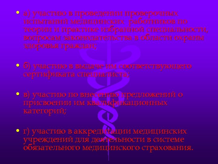 • а) участию в проведении проверочных испытаний медицинских работников по теории и практике избранной специальности, вопросам законодательства в области охраны здоровья граждан; • б) участию в выдаче им соответствующего сертификата специалиста; • в) участию по внесению предложений о присвоении им квалификационных категорий; • г) участию в аккредитации медицинских учреждений для деятельности в системе обязательного медицинского страхования.