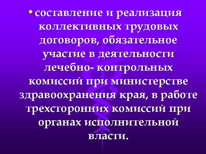 • составление и реализация коллективных трудовых договоров, обязательное участие в деятельности лечебно- контрольных комиссий при министерстве здравоохранения края, в работе трехсторонних комиссий при органах исполнительной власти.