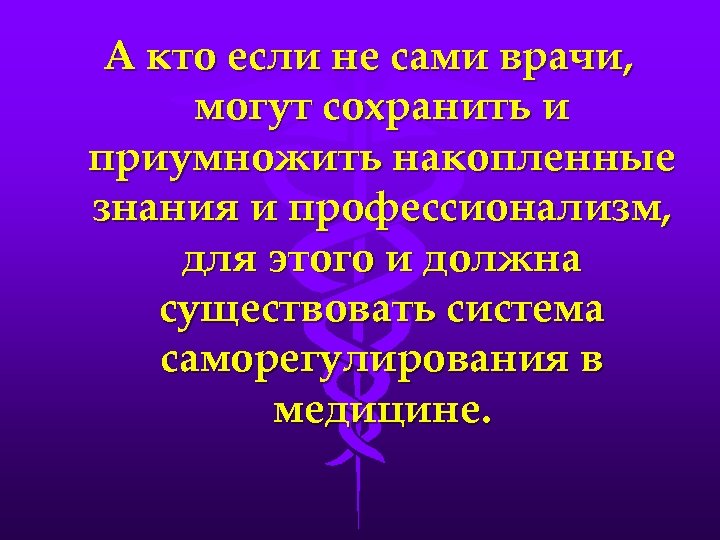 А кто если не сами врачи, могут сохранить и приумножить накопленные знания и профессионализм, для этого и должна существовать система саморегулирования в медицине.