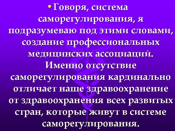 • Говоря, система саморегулирования, я подразумеваю под этими словами, создание профессиональных медицинских ассоциаций. Именно отсутствие саморегулирования кардинально отличает наше здравоохранение от здравоохранения всех развитых стран, которые живут в системе саморегулирования.