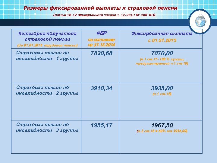 Размеры фиксированной выплаты к страховой пенсии (статьи 16 -17 Федерального закона т. 12. 2013 № 400 -ФЗ) Категория получателя страховой пенсии (до 01. 2015 трудовой пенсии) ФБР по состоянию на 31. 12. 2014 Страховая пенсия по инвалидности 1 группы 7820, 68 Страховая пенсия по инвалидности 2 группы 3910, 34 Страховая пенсия по инвалидности 3 группы 1955, 17 Фиксированная выплата с 01. 2015 7870, 00 (ч. 1 ст. 17 - 100 % суммы, предусмотренной ч. 1 ст. 16) 3935, 00 (ч. 1 ст. 16) 1967, 50 (ч. 2 ст. 16 = 50% от 3935, 00)