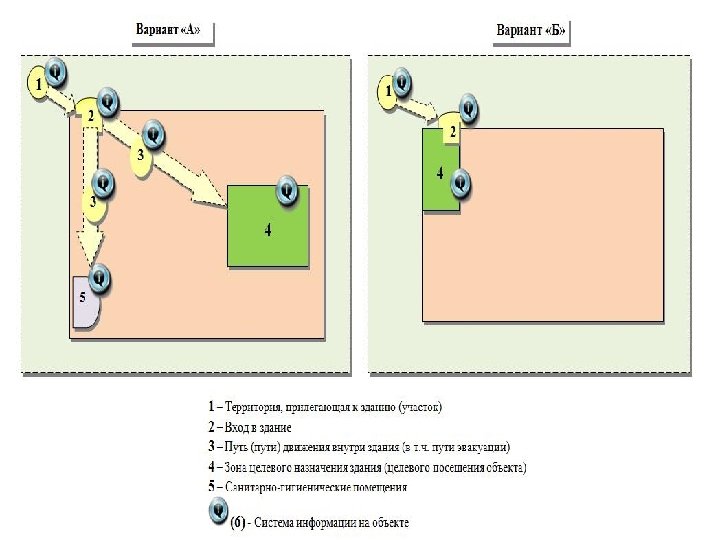 Основные структурно-функциональные зоны и элементы зданий и сооружений 3. Путь (пути) движения внутри здания (в т. ч. пути эвакуации) 4. Зона целевого назначения здания (целевого посещения объекта) 5. Сан. -гигиенические помещения 2. В ход в зд (вход ани ы) е 1. Территория, прилегающая к зданию (участок) 6. Система информации на объекте (устройства и средства информации и связи и их системы)