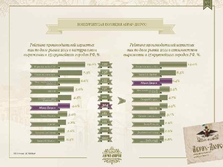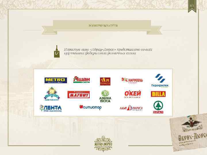 Продажи • В 2011 г. продано 15, 8 млн. бутылок общей стоимостью $86 184 тыс. ; • Средняя цена бутылки игристого вина в розничных сетях: 350 -500 руб. ; • Чистая прибыль компании в 2011 г. составила $14 220 тыс. , что почти вдвое превышает показатель предыдущего года. • В 2012 году прирост продаж линейки Victor Dravigny составил 67% (соотв. плану).