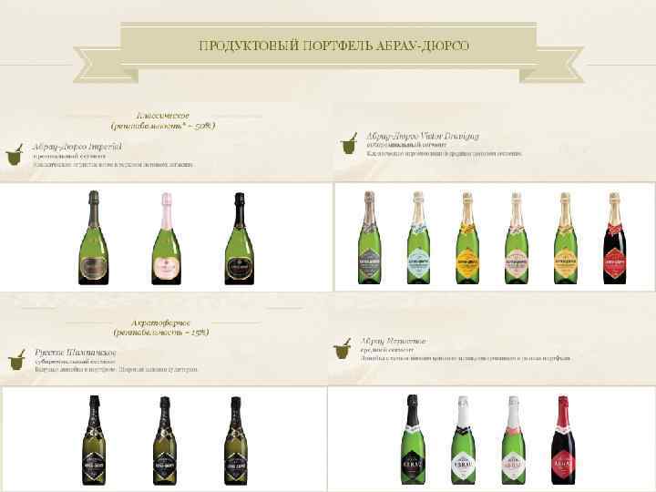 Матрица Ансоффа Существующий продукт Новый продукт Игристые вина 1. 2. Существующий рынок 1. Импортируемые французские игристые вина; Классические (бренды Victor 2. Легкие аперитивы Абрау. Dravigny, Imperial, Дюрсо; Миллезимы) 3. Крепленые вина Абрау. Акратофорные (бренды Дюрсо. Русское шампанское, ABRAU). Стратегия проникновения на рынок Стратегия развития продукта Стратегия развития рынка Диверсификация Рынок игристых вин Новый рынок 1. По видам товаров (например, рынок тихого вина, рынок крепленного вина, рынок аперитивов) 2. По территориальному признаку (выход на рынки ближнего и дальнего Зарубежья) 1. Туристический и гостиничный бизнес