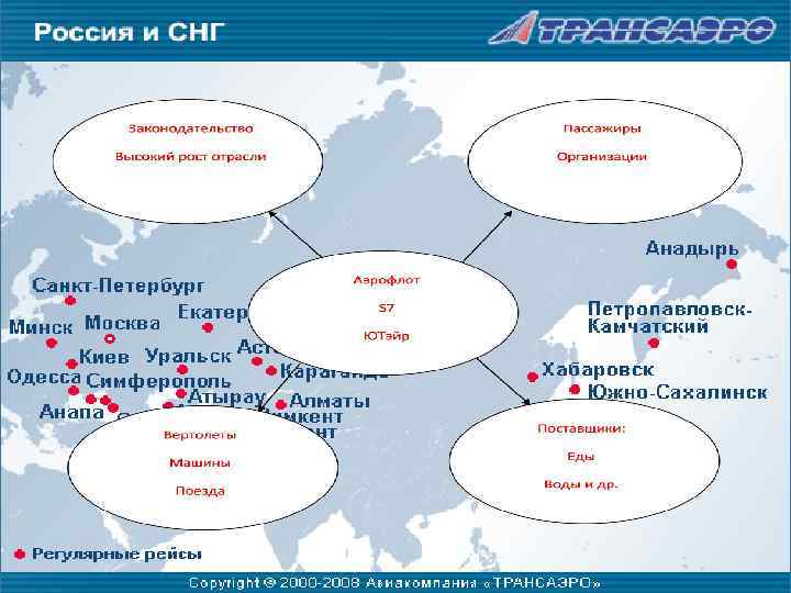 «Трансаэро» - первая частная авиакомпания в истории России. «Трансаэро» впервые в России оснастила свой парк современными самолетами иностранного производства, стала обслуживать пассажиров внутренних рейсов по международным стандартам (в том числе ввела для них бизнес-класс), создала гибкую систему тарифов и скидок, разработала и внедрила программы поощрения постоянных клиентов. Порт приписки — Международный аэропорт Домодедово. Как юридическое лицо, «Трансаэро» была зарегистрирована в Москве. 19 января 2006 года компания перерегистрировалась в Санкт-Петербурге. v 1992 - «Трансаэро» получает свой первый самолет - Ил-86 Начинает выполняться первый регулярный рейс «Трансаэро» Москва – Норильск. v 1993 - «Трансаэро» первой в России получает самолеты «Боинг» . «Трансаэро» начинает выполнять регулярные рейсы из Москвы в Киев, Алма-Ату, Минск, Ригу. v 1994 - «Трансаэро» открывает регулярные рейсы в Новосибирск, Ташкент, Екатеринбург, Одессу, Лондон (через Ригу), Эйлат, Баку, Владивосток, Нижневартовск. v 1995 - «Трансаэро» начинает регулярные полеты в Санкт-Петербург, Иркутск, Южно-Сахалинск, Берлин, Франкфурт-на-Майне. «Трансаэро» впервые в России разрабатывает и вводит в действие специальную программу поощрения постоянно летающих пассажиров «Трансаэро Привилегия» . В ноябре по личной просьбе Президента Казахстана Нурсултана Назарбаева выполняется первый рейс «Трансаэро» по маршруту Москва - Астана (тогда еще Акмола). «Трансаэро» становится первой иностранной авиакомпанией, открывшей воздушное сообщение с будущей казахстанской столицей.