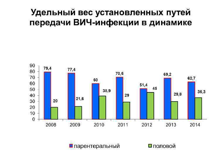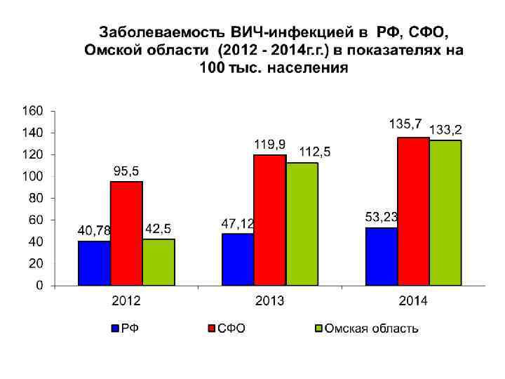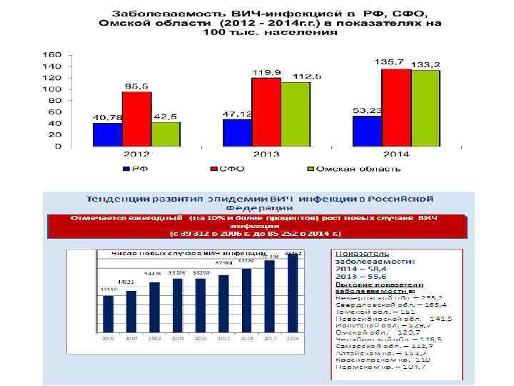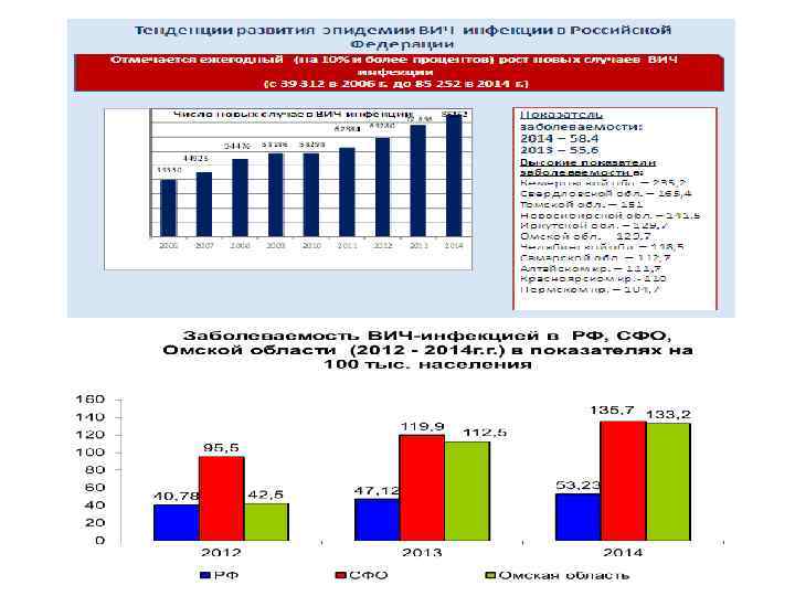 Тенденции развития эпидемии ВИЧ-инфекции в Российской Федерации Отмечается ежегодный (на 10% и более процентов) рост новых случаев ВИЧинфекции (с 39 312 в 2006 г. до 85 252 в 2014 г. ) Число новых случаев ВИЧ-инфекции Показатель заболеваемости: 2014 – 58, 4 2013 – 55, 6 Высокие показатели заболеваемости в: Кемеровской обл. – 235, 2 Свердловской обл. – 165, 4 Томской обл. – 151 Новосибирской обл. – 141. 5 Иркутской обл. – 129, 7 Омской обл. – 129, 7 Челябинской обл. – 118, 5 Самарской обл. – 112, 7 Алтайском кр. – 111, 7 Красноярском кр. - 110 Пермском кр. – 104, 7