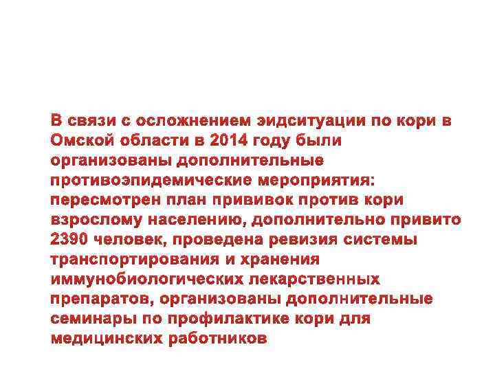 Задачи по профилактике вакциноуправляемых инфекций • Обеспечить своевременное проведение противоэпидемических мероприятий в очагах, качественное планирование и проведение профилактических прививок, обратив особое внимание на иммунизацию против кори, в том числе мигрантов, членов религиозных общин, других труднодоступных для иммунопрофилактики групп населения; • Принять меры по выполнению в полном объеме мероприятий плана реализации программы «Профилактика кори и краснухи в период верификации их элиминации в Российской Федерации (2013 -2015 гг. )» на территории Омской области; • Повысить уровень привитости против вакциноуправляемых инфекций, обеспечить показатели своевременности охвата детей прививками в декретированных возрастах не менее 96, 0%.