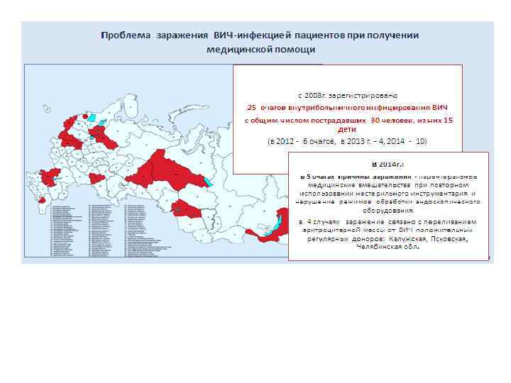 В РФ с 2008 года по 2014 год зарегистрировано 25 случаев формирования очагов внутрибольничного инфицирования ВИЧ с общим числом пострадавших 30 человек, из них 15 дети, в том числе в 2014 году– 10 очагов В Омской области не зарегистрированы случаи заражения ВИЧ, связанные с оказанием медицинской помощи Необходимо обратить внимание на подготовку по вопросам ВИЧ –инфекции госпитальных эпидемиологов учреждений здравоохранения