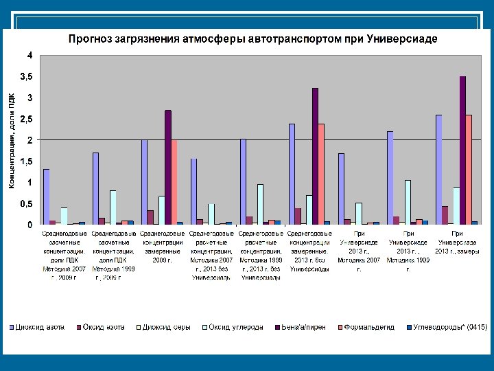 n Экологические проблемы г. Казани, связанные с подготовкой и проведением XXVII Всемирной летней Универсиады 2013 г. , и прогноз воздействия Универсиады на состояние окружающей среды г. Казани n Выполнено аналитическое наложение локальных воздействий и природоохранных мероприятий, предусмотренных проектами сооружения и функционирования объектов, предназначенных для проведения Универсиады. n 1. Разработан прогноз изменения состояния атмосферного воздуха в г. Казани в связи с увеличением автотранспорта при подготовке и проведении Универсиады n n Существующее положение по выбросам загрязняющих веществ в атмосферу от автотранспорта г. Казани на 2009 год показано в работе фирмы ООО «Эко-М» : «Оценка воздействия автотранспорта на состояние окружающей среды г. Казани в целях разработки и принятия комплекса мер по снижению выбросов загрязняющих веществ в атмосферный воздух от автотранспорта» . На основе документа рассчитаны средние значения концентраций загрязняющих веществ на наиболее нагруженных в период Универсиады перекрестках г. Казани.