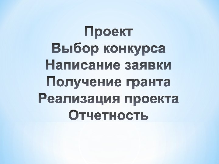 Общий подход к планированию и формированию заявок на гранты: 1. ТИТУЛЬНЫЙ ЛИСТ 2. РЕЗЮМЕ ЗАЯВКИ (АННОТАЦИЯ) 3. ВВЕДЕНИЕ 4. ПОСТАНОВКА ПРОБЛЕМЫ 5. ЦЕЛИ И ЗАДАЧИ ПРОЕКТА 6. МЕТОДЫ 7. ОЦЕНКА 8. ФИНАНСИРОВАНИЕ ПО ОКОНЧАНИИ ПЕРИОДА ПДОСТАВЛЕНИЯ ГРАНТА 9. БЮДЖЕТ 10. ВОЗМОЖНЫЕ ПРИЛОЖЕНИЯ К ЗАЯВКЕ САМОЕ ГЛАВНОЕ – СОБЛЮДЕНИЕ ТРЕБОВАНИЙ ФОНДА ПРИ ОФОРМЛЕНИИ ЗАЯВКИ