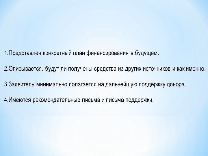Общие принципы написания заявок на гранты - Соблюдайте требования фонда - Скрупулезно следуйте правилам Вашу заявку могут отклонить просто на основании того, что Вы нарушили правила ее оформления - После написания заявки перечитайте ее вновь, проверяя, насколько точно она соответствует требованиям спонсора. - Старайтесь максимально точно соблюдать те критерии, которые упомянуты Вашим потенциальным источником финансирования в информационных материалах. Любые грамматические и орфографические ошибки вызывают негативное отношение к заявке.