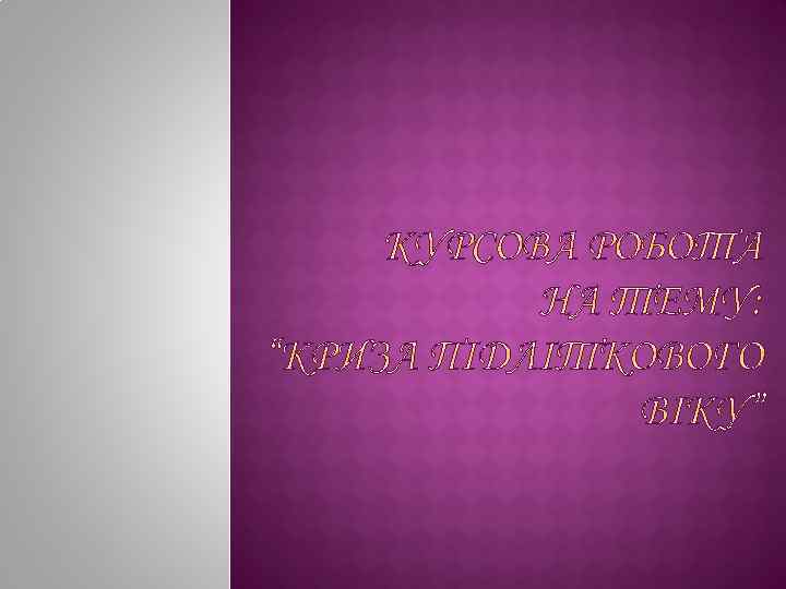 Об’єкт дослідження – психічний розвиток підлітка. Предмет дослідження – криза підліткового віку. Мета дослідження – виявлення впливу підліткової кризи на особистість дитини.