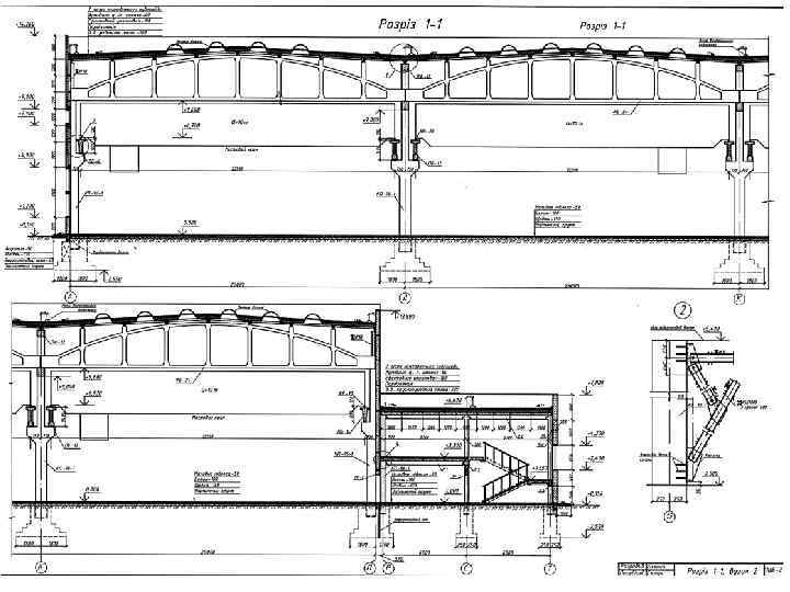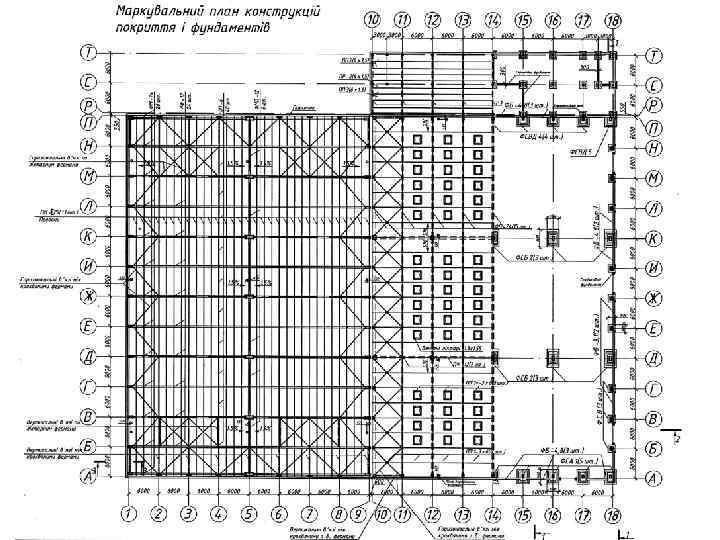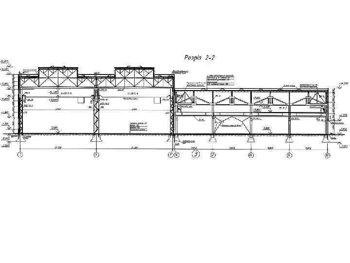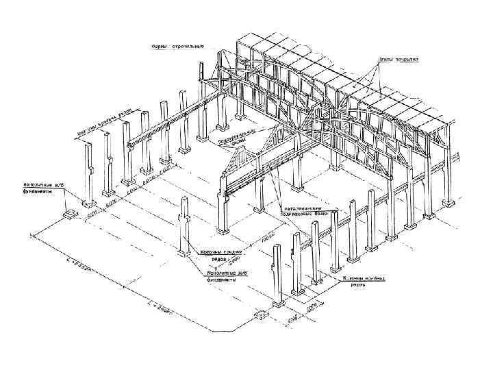 Одноповерхова виробнича будівля з покриттям по залізобетонних ґратчастих балках: 1 – стовповий фундамент під середню колону; 2 – те саме, під фахверкову колону; 3 – балка фундаментна; 4 – колона середня; 5 – колона фахверкова; 6 – фахверковий стояк (приколонний); 7 – металева надставка; 8 – ґратчаста кроквяна балка; 9 – підкроквяна балка; 10 – несуча балка підвісного кранового шляху; 11 – підвіска балки кранового шляху; 12 – плита покриття; 13 – утеплювач по шару пароізоляції; 14 – зенітний ліхтар; 15 – лійка внутрішнього водовідводу; 16 – парапет; 17 – стінова панель