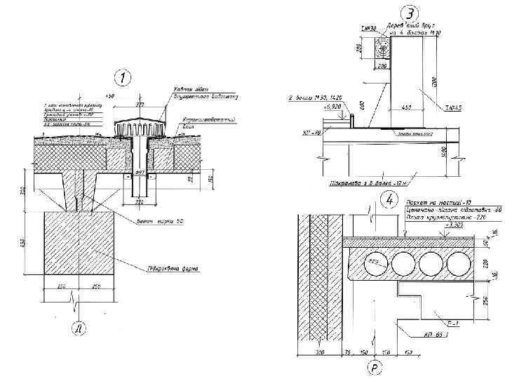 Одноповерхова виробнича будівля з покриттям по залізобетонних фермах: 1 – стовпчастий фундамент під середню колону; 2 – те саме, під крайню колону; 3 – балка фундаментна; 4 – опорний бетонний стовпчик; 5 – вимощення; 6 – утеплення фундаментної балки; 7 – колона фахверкова; 8 – колона середня; 9 – підкранова балка прогоном 6 м; 10 – те саме, прогоном 12 м; 11 – кранова рейка; 12 – кроквяна ферма; 13 – підкроквяна ферма; 14 – надопорний стояк; 15 – плита покриття; 16 – утеплювач по пароізоляції; 17 – покрівельний гідроізоляційний шар; 18 – надбудований ліхтар; 19 – лійка внутрішнього водовідводу; 20 – температурнодеформаційний шов; 21 – вертикальні зв’язки між колонами; 22 – цокольна панель; 23 – стінова панель; 24 – віконна панель; 25 – карнизна панель