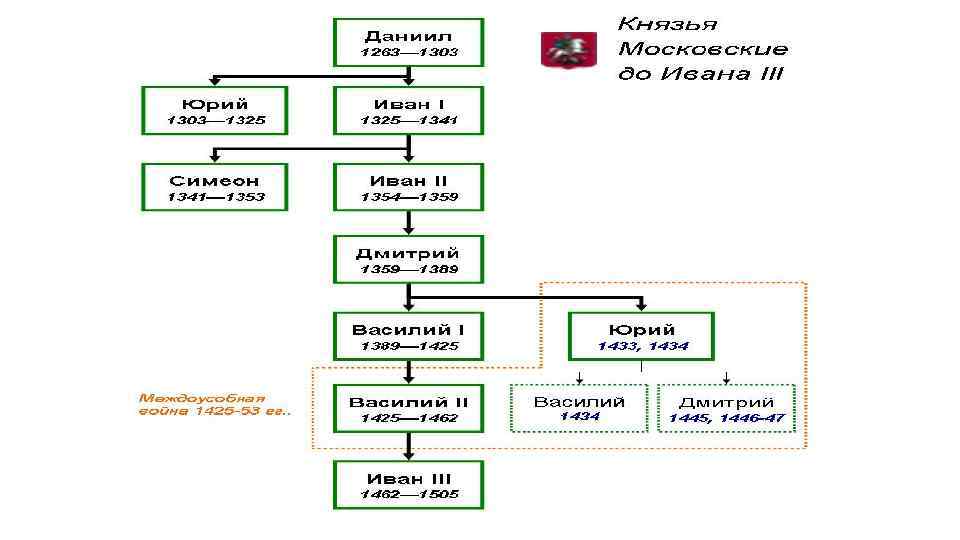 Сын Дмитрия Донского и брат Василия I Сын Василия I и внук Дмитрия Донского Феодальная война 1433 -1453 гг. Василий II Васильевич Темный (1425 -1462) × Юрий Дмитриевич Галицкий Василий Косой Дмитрий Шемяка Дмитрий Красный Причина – вопрос о престолонаследии: По завещанию Дмитрия Донского, Московское княжество после смерти Василия I должно было перейти Юрию. Но ко времени составления завещания у Василия I не было детей. Повод – скандал: 8 февраля 1433 г. на свадьбе Василия II Софья Витовтовна (мать Василия II) сорвала драгоценный пояс, принадлежавший ранее Дмитрию Донскому, с Василия Косого. Основные события: 1434 г. – Юрий Дмитриевич объявил себя великим князем и умер 1434 г. – Василий Косой объявил себя великим князем 1436 г. – Василий Косой был ослеплен и посажен в темницу 1445 г. – Василий II был взят плен ханом Улу-Мухаммедом и отпущен за огромный выкуп 1446 г. – Василий II был ослеплен Дмитрием Шемякой 1453 г. – Дмитрий Шемяка умер, война закончилась