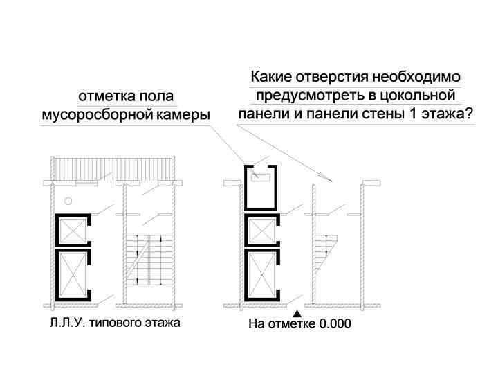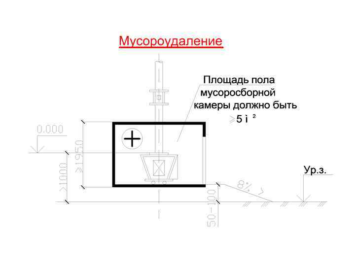 Мусоросборная камера должна иметь: 1. Самостоятельный вход с открывающейся наружу дверью. 2. Подводку горячей наружной воды. 3. Глухую стенку (экран), отделяющий вход в камеру от входа в здание.