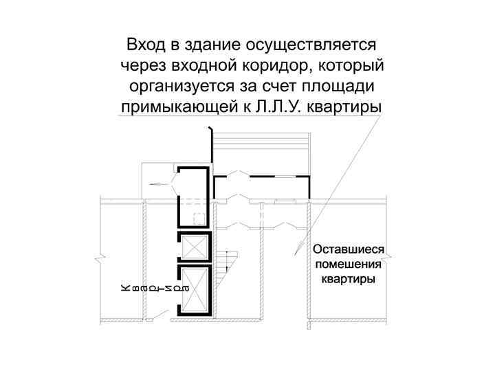 В оставшихся помещениях квартиры целесообразно разместить помещения общественного пользования: Колясочные, велосипедные; n Группы для дошкольного воспитания; n Приёмный пункт прачечной n И т. п. Возможна организация ещё одного отдельного входа n