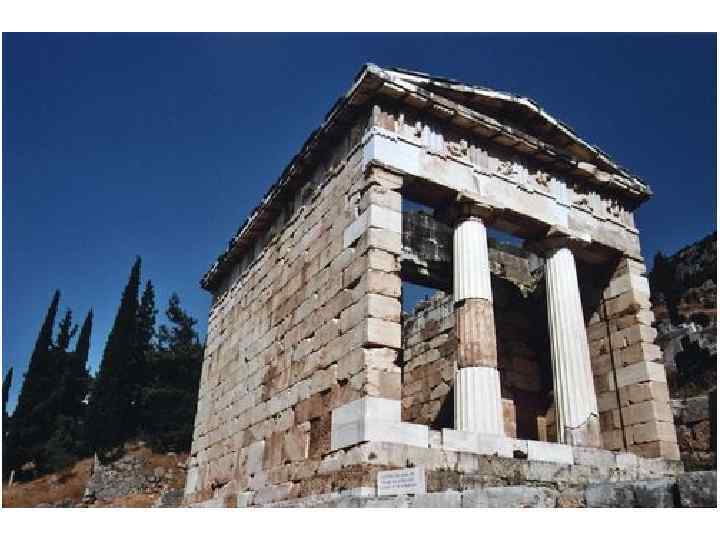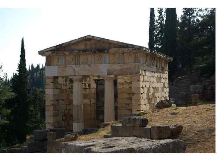 • Дельфы – город на С-З Фокиды, близ горы Парнас • Общегреческий религиозный центр с храмом и оракулом Аполлона, • Место проведения Пифийских игр VI-V вв. до н. э. • Согласно археологам, объектом поклонения в Дельфах начиная примерно с 1600 г. до н. э. было женское божество, связанное с культом Матери Земли. • Считался центром земли • Раскопки проводились с 1892 г. • В комплекс включены: храм Аполлона, театр, стоя, 2 сокровищницы, стадион