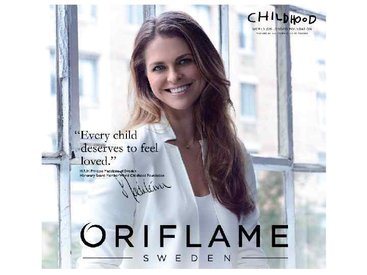 Вопросы В. Какую поддержку оказывает Орифлэйм Международному детскому фонду? Начиная с 2015 года Oрифлэйм совместно с фондом Орифлэйм начинает новый проект, в итоге в течение 3 лет мы обязуемся собрать добровольные пожертвования в размере 10 млн шведских крон, эти средства будут перечислены в Международный детский фонд. В. Какова роль Ее королевского Высочества принцессы Швеции Мадлен в этом проекте? Ее королевское Высочество принцесса Швеции Мадлен – Почетный член попечительского совета Международного детского фонда, активно поддерживающая различные благотворительные программы во всем мире. Совместно с Орифлэйм принцесса проводит только акцию Международного детского фонда, не участвуя в других проектах компании.