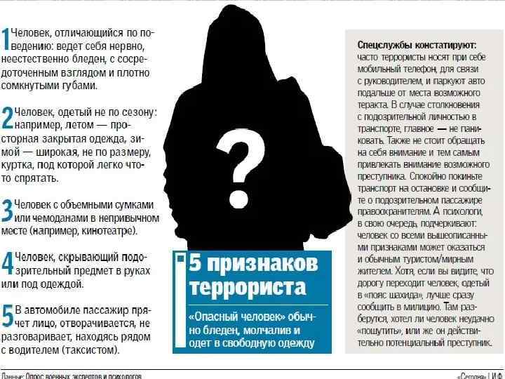 Предварительное изучение объекта теракта Организаторы террористических акций всегда предварительно изучают место совершения будущего теракта, для чего проводят видео- и фотосъемку, составляют схемы объекта и путей подхода к нему, пытаются получить данные о системе безопасности объекта, в том числе и через сотрудников охраны. Что делать, если вы подозреваете кого-то в подготовке теракта? Специалисты рекомендуют не делать никаких резких движений и не пытаться самостоятельно решить проблему. Необходимо найти сотрудника полиции и сообщить ему о своих подозрениях, при этом важно как можно более точно описать человека, которого вы заметили. Пытаться следить за возможным террористом или обезвреживать его самому не стоит, это очень опасно.
