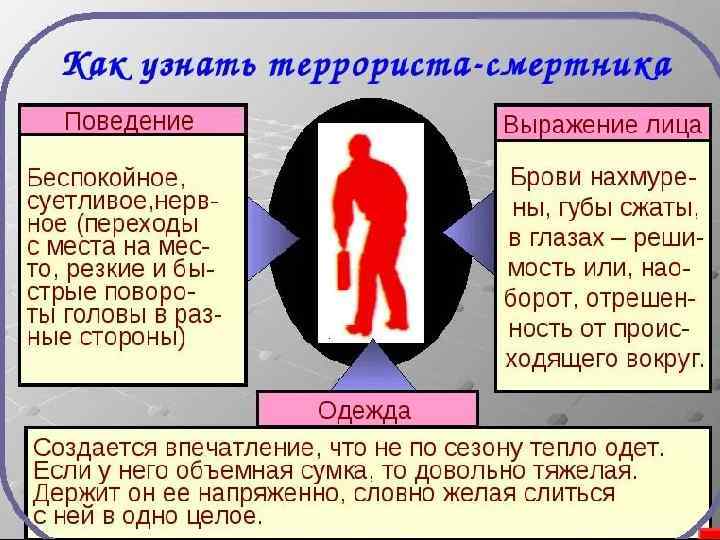 КАК РАСПОЗНАТЬ ТЕРРОРИСТА ПО ВНЕШНИМ ПРИЗНАКАМ? Специалисты утверждают, что большинство террористов это люди в возрасте от 20 до 30 лет, одежда их может не соответствовать погоде, ведь она предназначена не для комфорта человека, а для наилучшей маскировки взрывного устройства. Если террорист женщина, то она будет носить национальный головной убор, если это мужчина, то он будет чисто выбрит, это обязательное условия для мусульман, которые чтут Коран. По их вере, чисто выбритое лицо (для парней) и наличие головного убора (для девушек) необходимо при подготовке к смерти. Существует два типа поведения: v Человек неестественно бледен, его взгляд «бегает» , не концентрируясь ни на чем, он ведет себя слишком тихо, не делает резких движений. v Человек сильно возбужден, размахивает руками, его взгляд постоянно перемещается с одного объекта на другой, он не может стоять спокойно и постоянно перемещается, причем двигаясь бесцельно.