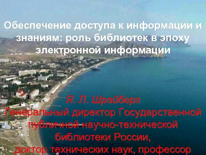 Обеспечение доступа к информации и знаниям: роль библиотек в эпоху электронной информации Я. Л. Шрайберг Генеральный директор Государственной публичной научно-технической библиотеки России, доктор технических наук, профессор