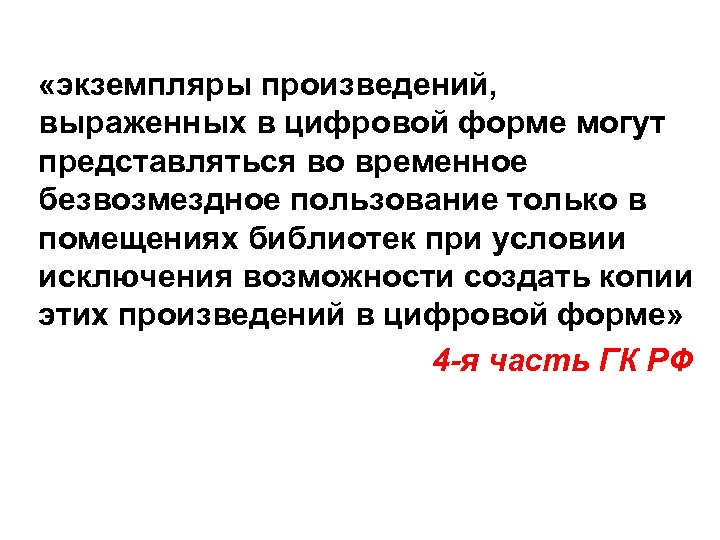 «экземпляры произведений, выраженных в цифровой форме могут представляться во временное безвозмездное пользование только в помещениях библиотек при условии исключения возможности создать копии этих произведений в цифровой форме» 4 -я часть ГК РФ