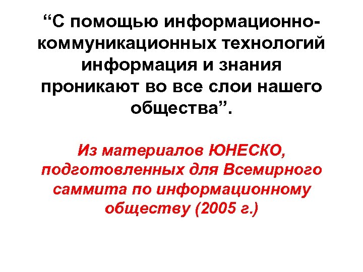 “С помощью информационнокоммуникационных технологий информация и знания проникают во все слои нашего общества”. Из материалов ЮНЕСКО, подготовленных для Всемирного саммита по информационному обществу (2005 г. )