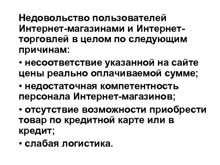 Недовольство пользователей Интернет-магазинами и Интернетторговлей в целом по следующим причинам: • несоответствие указанной на сайте цены реально оплачиваемой сумме; • недостаточная компетентность персонала Интернет-магазинов; • отсутствие возможности приобрести товар по кредитной карте или в кредит; • слабая логистика.