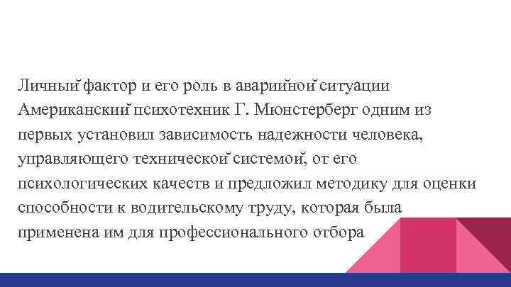 Личныи фактор и его роль в аварии нои ситуации Американскии психотехник Г. Мюнстерберг одним из первых установил зависимость надежности человека, управляющего техническои системои , от его психологических качеств и предложил методику для оценки способности к водительскому труду, которая была применена им для профессионального отбора