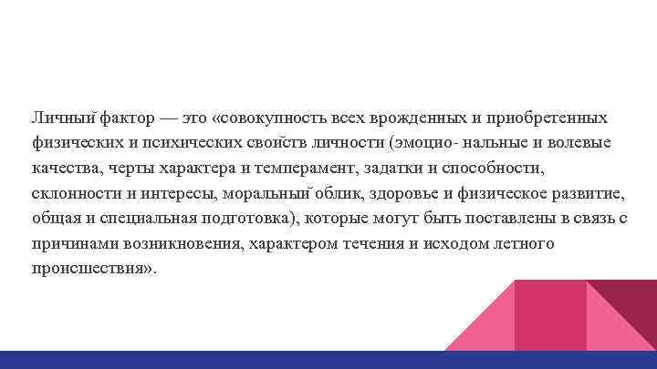 Личныи фактор — это «совокупность всех врожденных и приобретенных физических и психических свои ств личности (эмоцио- нальные и волевые качества, черты характера и темперамент, задатки и способности, склонности и интересы, моральныи облик, здоровье и физическое развитие, общая и специальная подготовка), которые могут быть поставлены в связь с причинами возникновения, характером течения и исходом летного происшествия» .