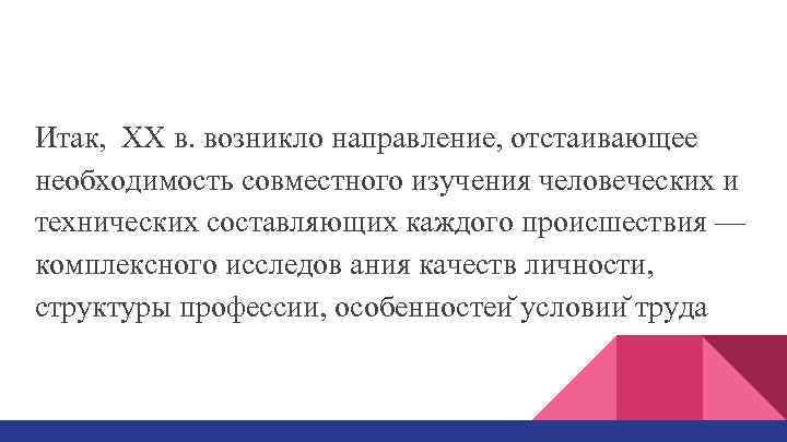 Итак, XX в. возникло направление, отстаивающее необходимость совместного изучения человеческих и технических составляющих каждого происшествия — комплексного исследов ания качеств личности, структуры профессии, особенностеи условии труда