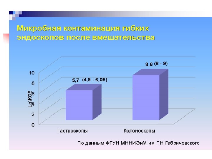 ФАКТОРЫ ПЕРЕДАЧИ ИНФЕКЦИИ ПРИ ЭНДОСКОПИЧЕСКИХ МАНИПУЛЯЦИЯХ n n n n Эндоскопы Инструменты к эндоскопам Автоматические машины Руки персонала Орошающие растворы Лекарственные препараты, вводимые через эндоскоп Инфицированные растворы дезинфицирующих средств многократного применения Предметы окружающей среды (емкости для растворов, рабочие столы, хирургические перчатки, расходный материал)